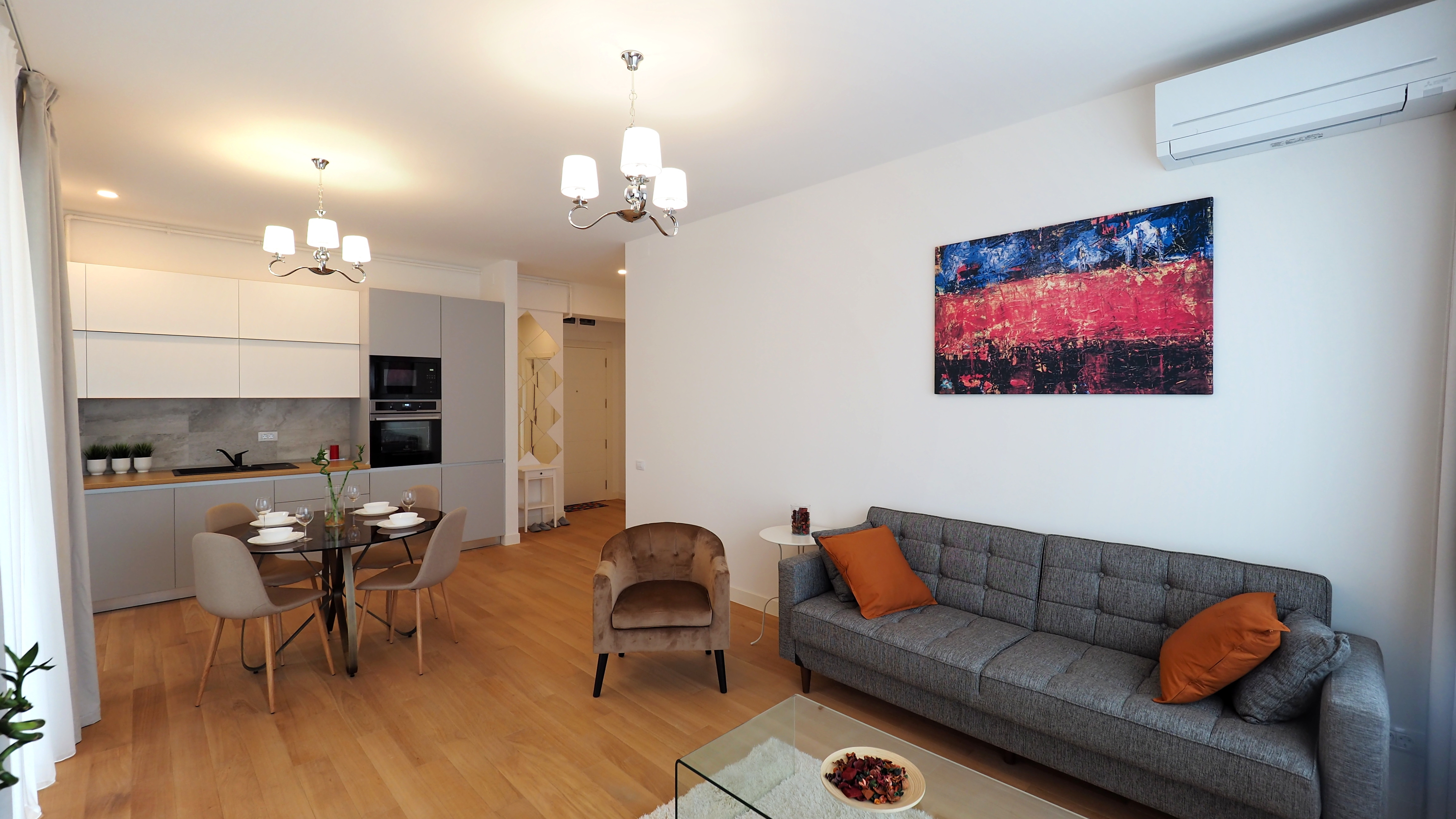 Este compus din living insorit cu zona de dining si bucatarie complet echipata, terasa spatioasa, zona dressing, baie si dormitor.